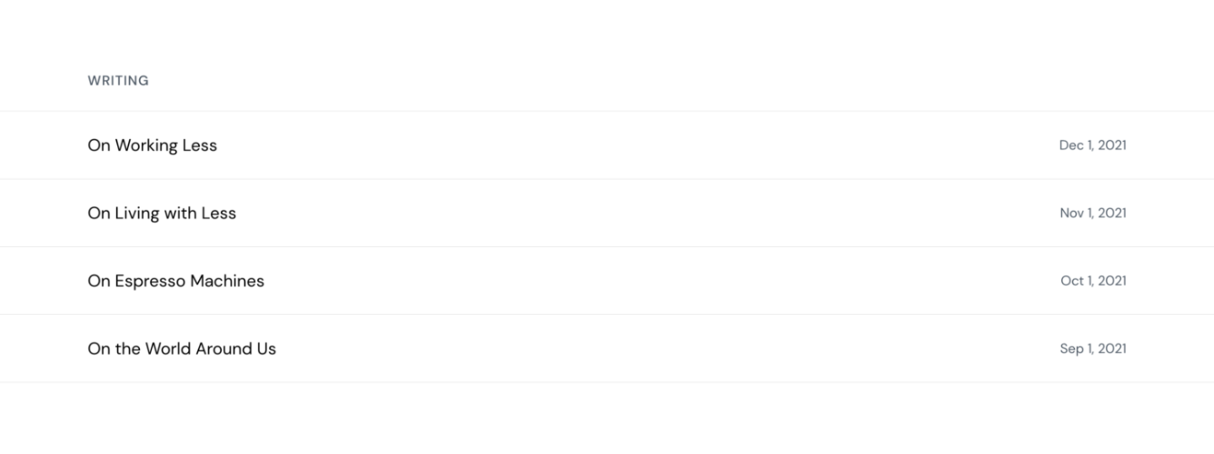 You will have a list of all work posts under the /work/ URL. The same goes for writing under /writing/.