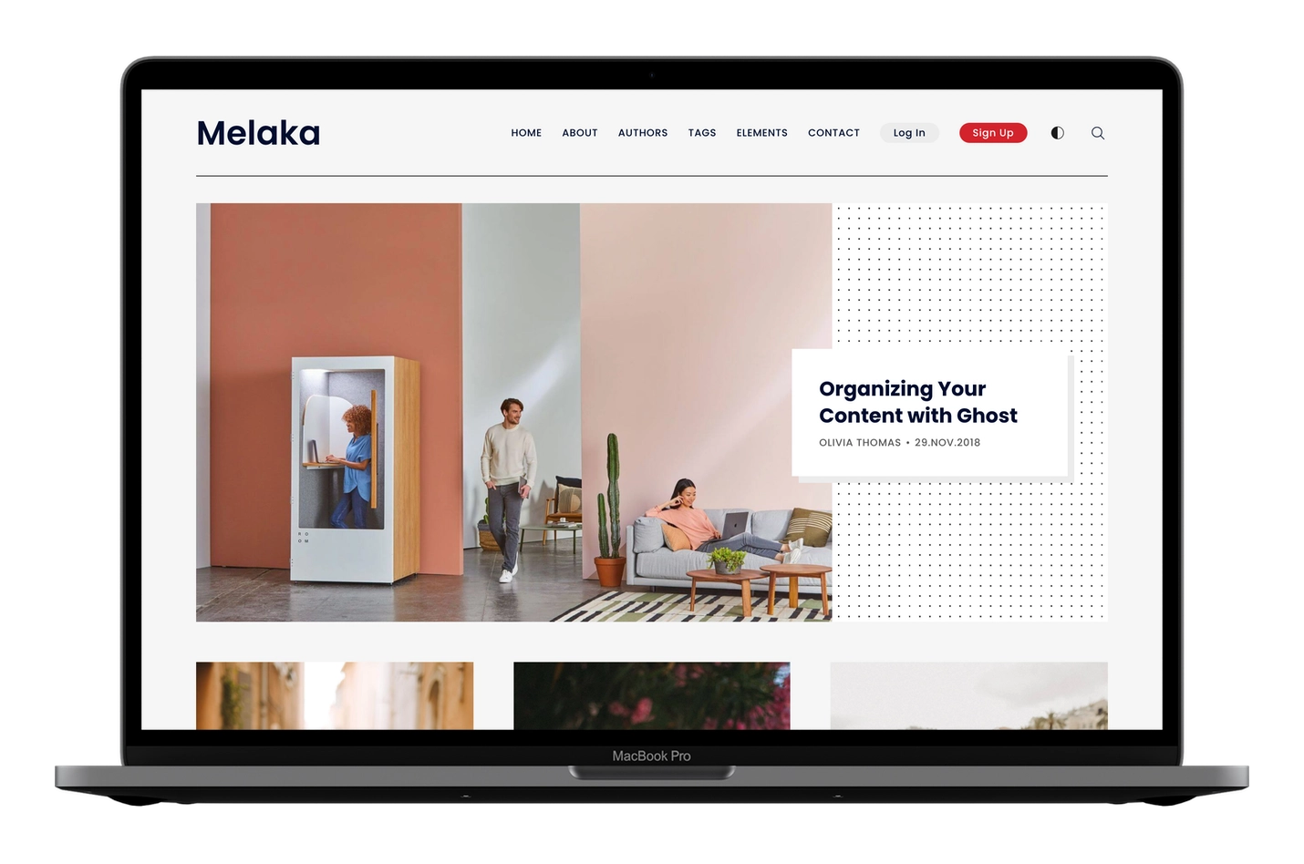Make great first impressions. This Ghost theme has a new color scheme and a unique home page design.
